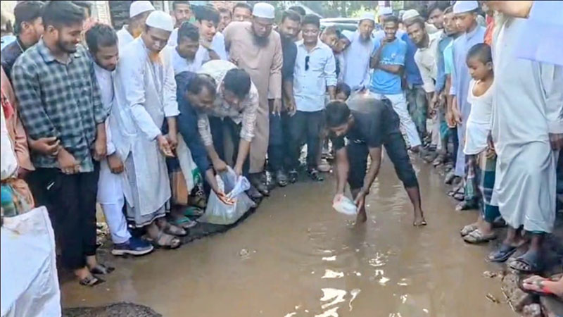 কুমিল্লার দেবীদ্বারে সড়কে মাছ ছেড়ে হাসনাত আবদুল্লাহ’র প্রতিবাদ